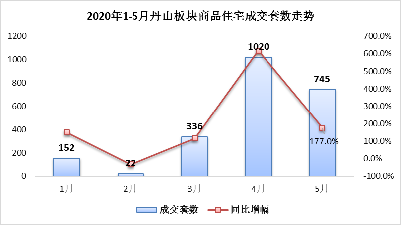 4月份,疫情期間主城區被壓抑的需求爆發,帶動丹山版塊商品住宅成交套數高達到1020套,同比(比去年同期)增幅高達600%以上。5月份,成交規模雖有所減緩,但同比增幅仍在177%。
