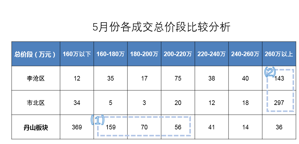 選擇丹山版塊的客群中,市區外溢的改善型需求是主力之一。從總價段比較分析來看(下圖),丹山版塊在160-220萬元三個總價段成交比較集中,是改善型需求的主力價格段(如1所示),而市北、李滄的改善需求成交主力都260萬元以上,甚至更高(如2所示)。