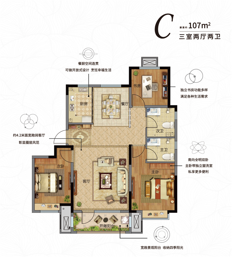 全明方正戶型,南北通透,瞰景寬綽陽臺,與家人一同共享四季景致的更替和全齡社區(qū)的活力。超尺度陽臺,除了晾曬、瞰景等常規(guī)功能外,多功能空間布局,匹配家庭每位成員的生活渴望。舒適主臥配備瞰景飄窗,締造生活儀式感;部分實景現(xiàn)房交付,即買即入住,幸福不必等待。
