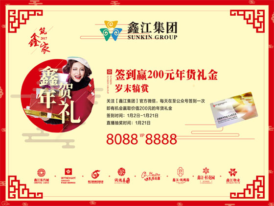 1月2日-1月21日,關(guān)注【鑫江集團】微信公眾號,在線報名申請年貨禮金,期間累計簽到十次,即有機會免費參與1月21日,禮金直播抽獎,現(xiàn)場抽出200位獲獎粉絲,每位送出200元年貨禮金!