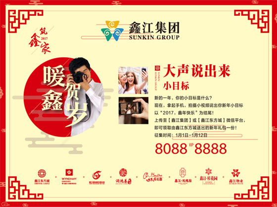 1月1日-1月12日,拍攝小視頻,說出你的新年小目標,以“2017,鑫年快樂“為結(jié)尾,上傳至【鑫江集團】或【鑫江東方城】微信公眾號,即可免費領(lǐng)取新年禮包一份,同時,1月21日-27日,【青島東方城】微信公眾號,將開啟在線有獎轉(zhuǎn)發(fā),轉(zhuǎn)發(fā)視頻圖文至朋友圈,即可免費領(lǐng)取新年好禮一份。