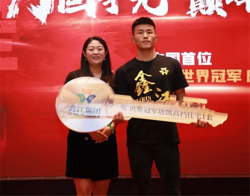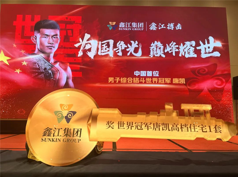 10月14日,鑫江集團為唐凱在鑫江溫德姆酒店舉辦了一場慶功宴會。在現場,鑫江集團董事長方潤超女士對唐凱勇奪世界冠軍表示祝賀,對教練和俱樂部為國爭光表示認可和鼓勵,也對鑫江國際搏擊俱樂部的未來寄予了深切厚望,同時向唐凱個人獎勵高檔房產1套、鑫江搏擊總教練劉金文個人和鑫江國際搏擊俱樂部各10萬元現金,并在現場與唐凱舉辦了續簽約儀式。