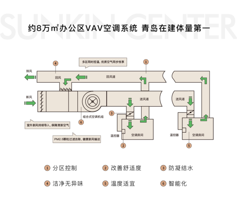 辦公空間中,鑫江中心引入VAV變風量空調系統,根據室內負荷變化或室內要求參數的變化,保持恒定送風溫度,并自動調節空調系統送風量,即以較小的耗能來滿足室內空氣環境的要求。適宜的溫度更為企業營造舒適辦公環境,提升工作效率。